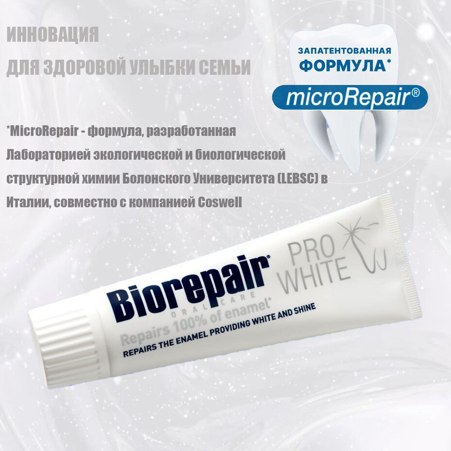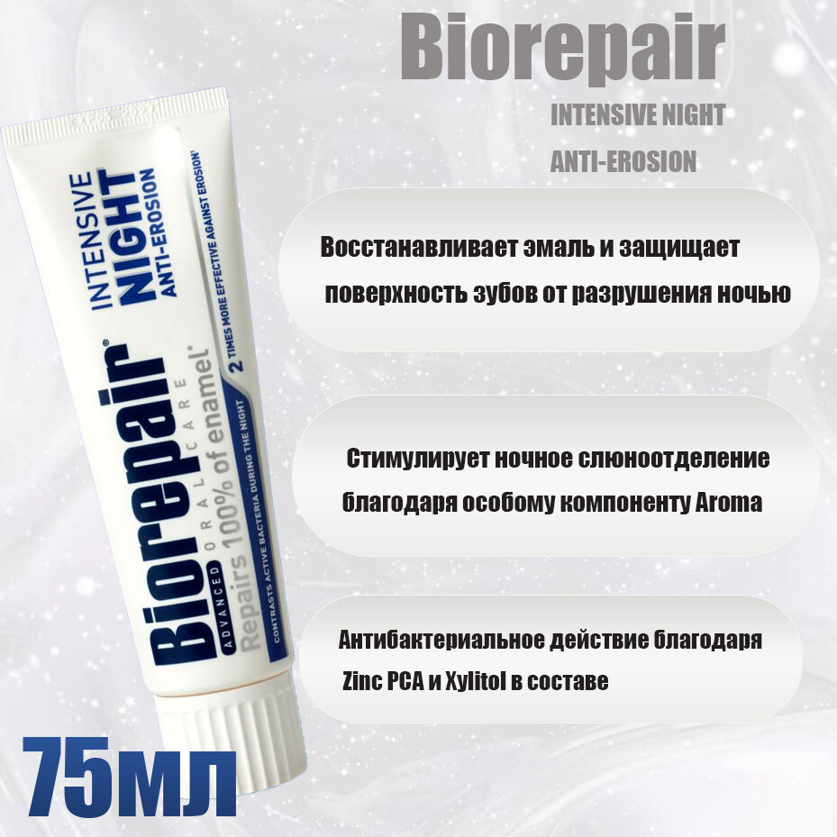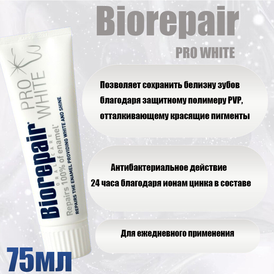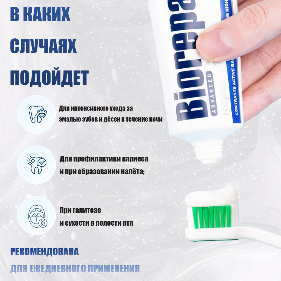 В наборе 2 зубных пасты, оказывающие комплексный уход за зубами в течение всего дня: Зубная паста Pro White 75 мл Имеет средний уровень абразивности RDA 50. Рекомендована для ежедневного ухода, профилактики кариеса, снижения чувствительности, после процедуры профессионального отбеливания и при необходимости соблюдения белой диеты. Создает тонкии? слои? на эмали зубов, отталкивающий красящие пигменты. Уникальная формула зубной пасты возвращает зубам здоровыи? блеск и дарит ежедневную защиту от любых внешних воздеи? ствии. Паста восстанавливает поврежденную, что снижает чувствительность зубов. Очищает эмаль от налета и мягких отложений. Зубная паста Intensive Night Repair 75 мл Имеет средний уровень абразивности RDA 50. Рекомендована для всей семьи - для интенсивного ухода в ночное время, при галитозе, эрозии эмали, бруксизме и для профилактики кариеса. Противодействует процессу разрушения зубной эмали, происходящему в ночное время. Особый ароматизатор, входящий в состав пасты, стимулирует ночное слюноотделение, способствуя самоочищению и увлажнению полости рта. Паста воздействует на бактериальную среду, подавляя ее размножение, тем самым не давая образовываться налету. Таким образом, восстанавливается уровень кислотности pH, зубы защищены от бактерий и кариеса, сохраняя свежесть дыхания. Применение: Выдавите пасту размером с горошину на зубную щетку и чистите зубы 2 минуты. Затем ополосните ротовую полость водой. Продукт подходит для ежедневного применения. Хранить при температуре 5-25С. Срок годности после вскрытия - 12 месяцев. Активы: Pro White: aqua, zinc hydroxyapatite*, glycerin, hydrated silica, sorbitol, silica, cellulose gum, xylitol, vp/va copolymer, sodium myristoyl sarcosinate, sodium methyl cocoyl taurate, aroma, sodium saccharin, citric acid, tetrapotassium pyrophosphate, zinc citrate, phenoxyethanol, benzyl alcohol, sodium benzoate, menthol, limonene. Intensive Night Repair: aqua, zinc hydroxyapatite*, hydrated silica, sorbitol, xylitol, glycerin, sodium myristoyl sarcosinate, sodium methyl cocoyl taurate, cellulose gum, silica, zinc pca, zinc citrate, aroma, tetrapotassium pyrophosphate, sodium benzoate, citric acid, ammonium acryloyldimethyltaurate/vp copolymer, sodium saccharin, benzyl alcohol, phenoxyethanol, limonene. * microRepair®