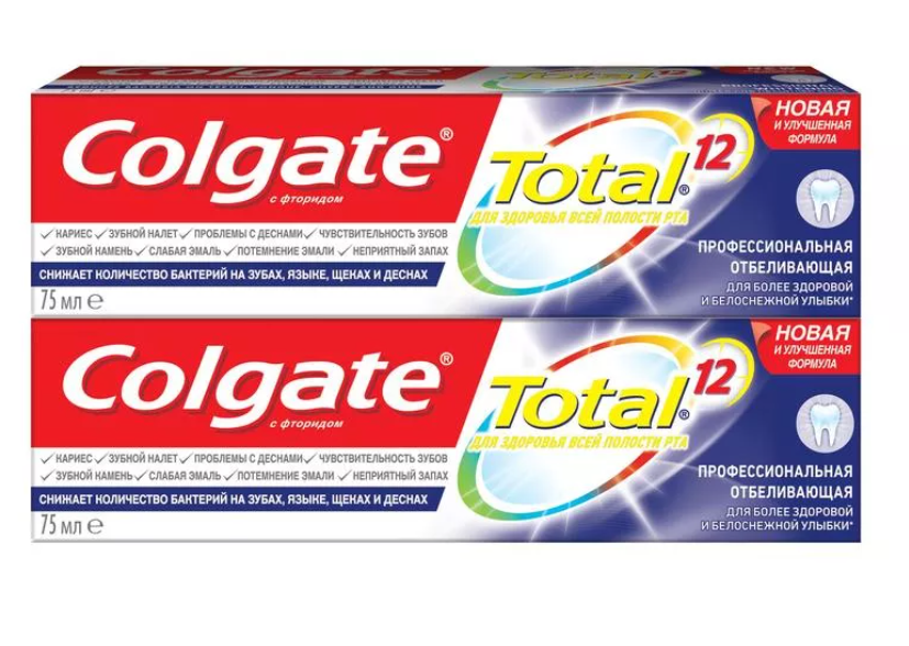 Colgate Зубная паста Total 12 "Професиональная отбеливающая", 75 мл, 2 шт. Уверенная и привлекательная улыбка начинается с белоснежных зубов и здоровья всей полости рта. Поэтому передовая формула нового Colgate Total 12 Профессиональная Отбеливающая помогает не только бороться с потемнениями на эмали, но также борется с бактериями на зубах, языке, щеках и деснах в течение 12 часов, обеспечивая здоровье всей полости рта. Новая зубная паста Colgate Total 12 Профессиональная Отбеливающая содержит передовую формулу, которая помогает бороться с потемнениями на эмали для более белоснежной улыбки. Она также борется с бактериями не только на зубах, но и на языке, щеках и деснах в течение 12 часов для здоровья всей полости рта. Colgate Total 12 Профессиональная Отбеливающая ежедневно обеспечивает превосходную защиту от налета, признаков воспаления десен при борьбе с бактериями, нейтрализацию неприятного запаха изо рта, защиту от разрушения эмали, повышенной чувствительности зубов, кариеса, налета, зубного камня, потемнений на эмали и проблем с деснами. В комплекте 2 уп.