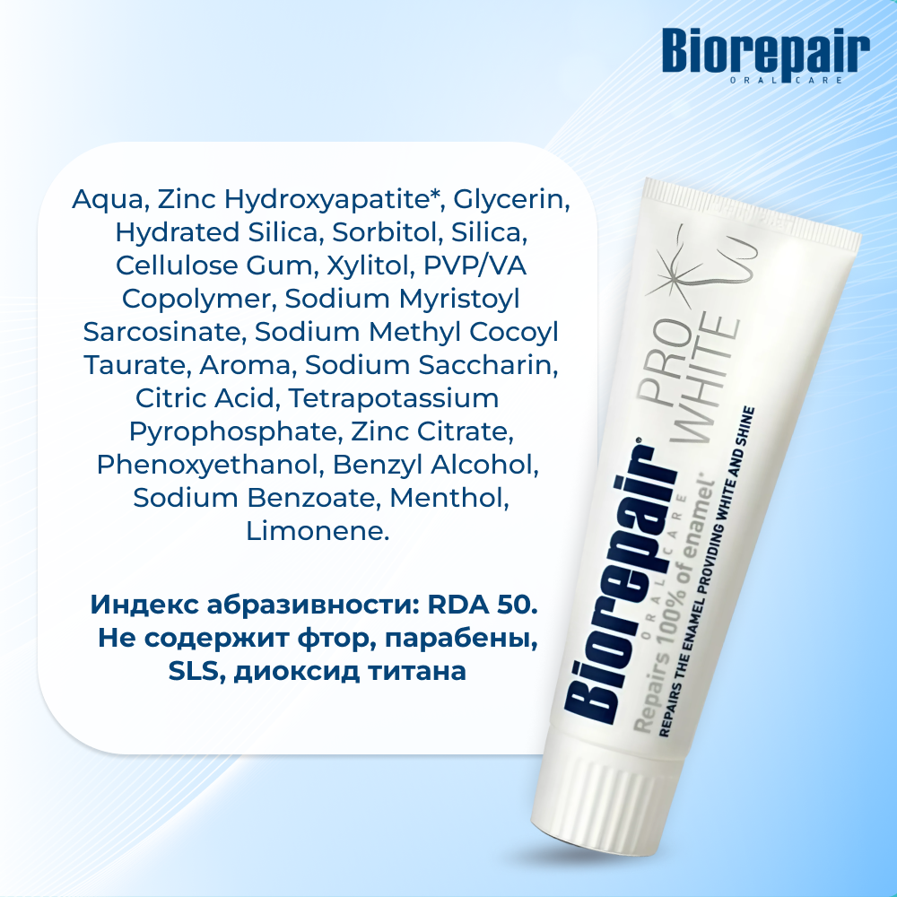 Зубная паста для ежедневного применения. Восстанавливает эмаль, сохраняет белизну зубов благодаря защитному полимеру PVP, отталкивающему красящие пигменты. Рекомендована после процедуры профессионального отбеливания. Зубная паста не содержит таких химических элементов, как парабены, титаниум диоксид, SLS и фтор.