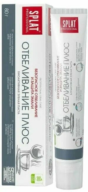 Зубная паста Splat Professional, отбеливание плюс, 100 мл Зубная паста SPLAT Professional «Отбеливание Плюс» (WHITE PLUS) со фтором ухаживает за зубами и безопасно отбеливает их благодаря уникальному чистящему комплексу Sp.White System. Натуральный фермент папаин и высокомолекулярный компонент полидон эффективно расщепляют налет, способствуют сохранению белизны. Ионы калия снижают повышенную чувствительность зубов. Фторид-ионы эффективно защищают от кариеса. Клинически доказанная эффективность за 4 недели применения: Отбеливающий эффект – 1,5 оттенка по шкале VITAPAN. Очищающий эффект – 50%. Реминерализующий эффект – 40%. Кровоостанавливающий эффект – 50,2%. Большого тюбика (100 мл) хватит надолго. Рекомендуется взрослым и детям с 14 лет. Срок годности: 36 Состав: Вода, гидрогенизированный гидролизат крахмала, диоксид кремния, нитрат калия, дикальцийфосфат дигидрат, ПЭГ-8, пирофосфат кальция, трифосфат натрия, ароматизатор, кокосульфат натрия, целлюлозная камедь, монофторфосфат натрия, CI 77891, лаурилсаркозинат натрия, ПВП, метилпарабен натрия, сахарин натрия, ментол, папаин, лимонен. В комплекте 2 шт