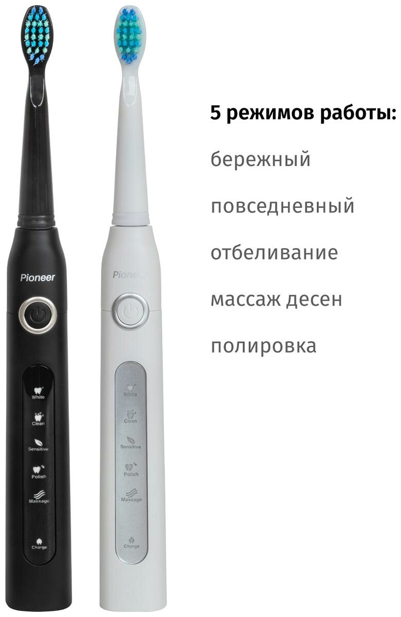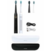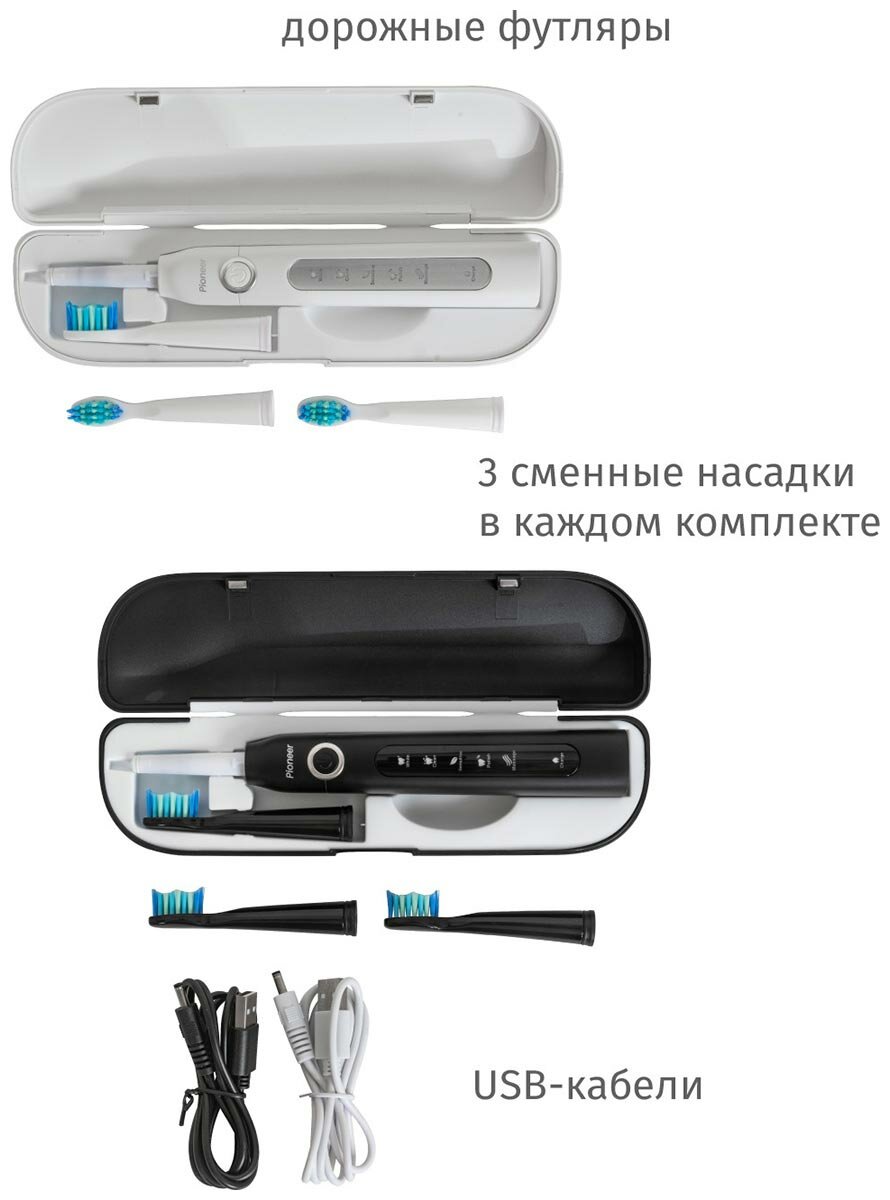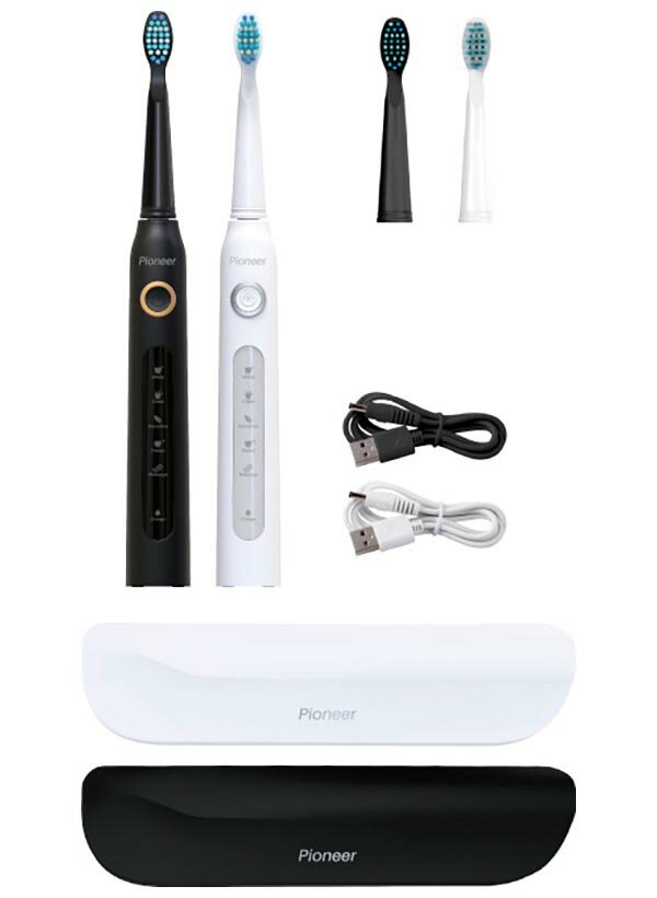 Комплект электрических зубных щеток для двоих Pioneer TB-5000 с водонепроницаемым корпусом IPX7, 3 сменными насадками в каждом комплекте, двумя USB кабелями и двумя дорожными футлярами. Наши электрические зубные щетки позволят вам производить качественный уход за полостью рта где угодно - дома, на даче или в поездках. Она удаляет бактерии, налет и остатки пищи даже из самых труднодоступных мест между зубами и деснами, а также подходит для чистки языка.