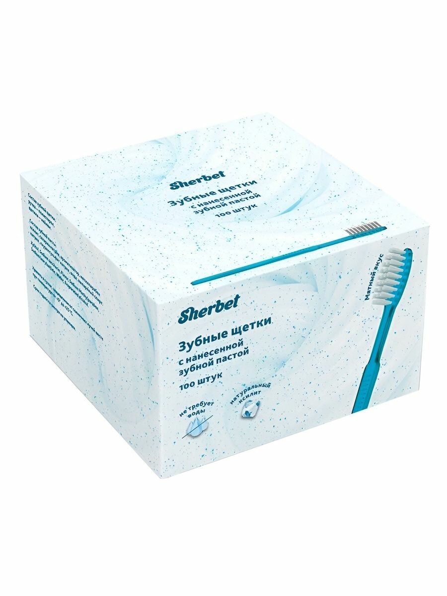 Одноразовые зубные щётки Sherbet (Щербет) «Мятный мусс» с ксилитом предназначены для проведения ежедневных процедур комплексной гигиены полости рта пациентам с 14 лет. Каждая щётка имеет щетину средней жесткости и упакована в индивидуальный гигиеничный пакетик с маркировкой.