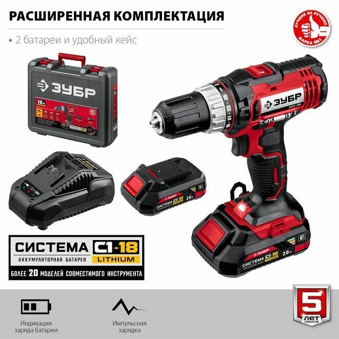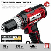 ЗУБР 18 В, 2 АКБ (2Ач), в кейсе, дрель-шуруповерт ДШЛ-185-22 Мастер