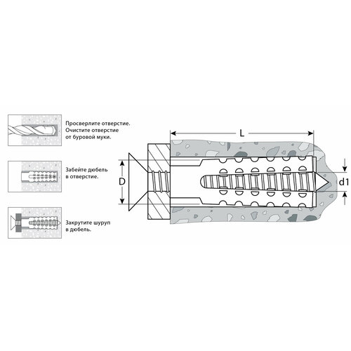 Технические характеристики и функции: : -Диаметр: 8 мм -Длина: 60 мм -Диаметр предварительного сверления: 10.0-12.0 мм -Диаметр шурупа (не входит в комплект поставки): 6.0-8.0 мм -Упаковка: 100 шт.