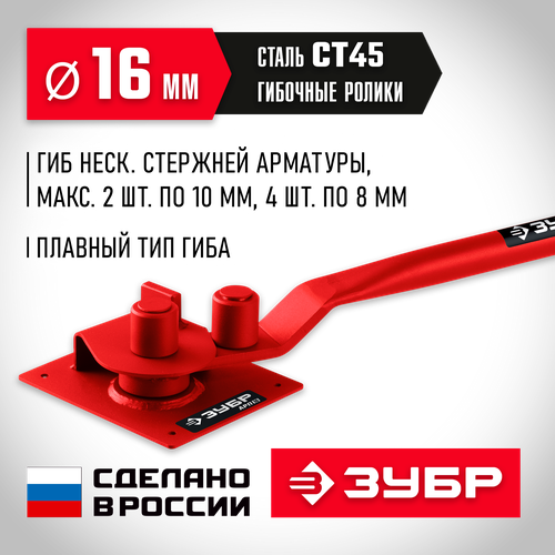 зубр арп-16 плавный гиб, арматурогиб (23422), дополнительные характеристики: закалённые узлы, 2 шт. по 10 мм или 4 шт. по 8 мм, габариты — 1170х160х85 мм.