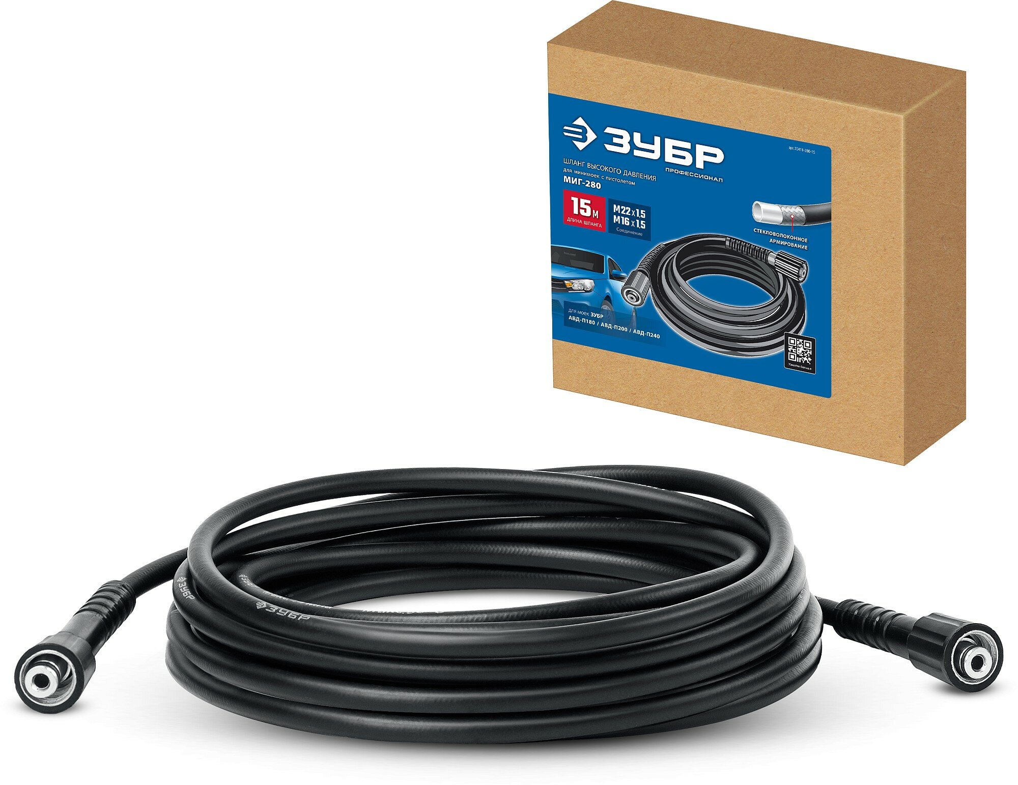 Шланг высокого давления ЗУБР 70411-280-15, предназначен для подачи воды под давлением на расстояние от изделия. Шланг имеет стекловолоконное армирование. Длина шланга 15 м. Надежное резьбовое соединение. Подходит для моек АВД-П180, АВД-П200, АВД-П240.