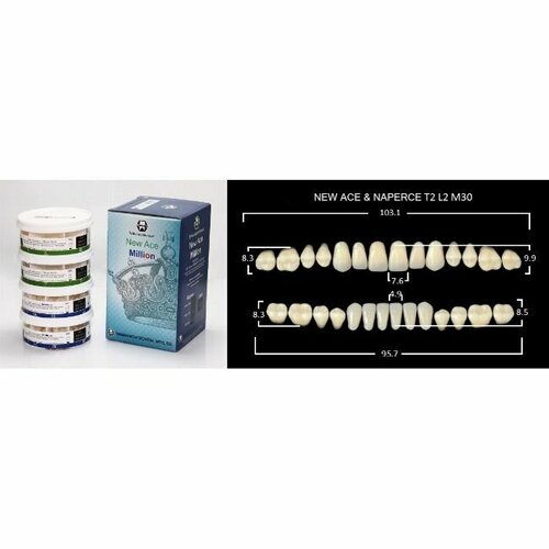 Купить Зубы акриловые, вариант исполнения: New Асе -двухслойные, фронтальные, ф. T2/L2. Million -однослойные, жевательные, фас. M30 (верх/низ). Цвет A3.5; 20 гарнитуров в боксах. с доставкой по всей России.