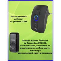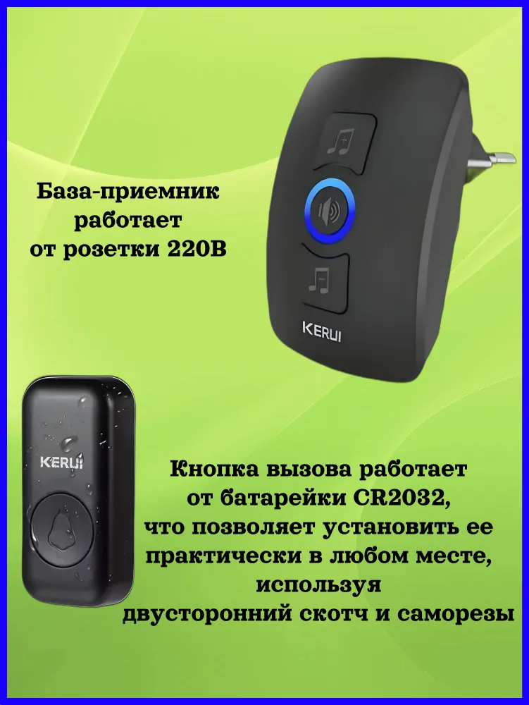 Кнопка вызова работает от батарейки CR2032, что позволяет установить ее практически в любом месте, используя двусторонний скотч и саморезы. В свою очередь, база-приемник работает от розетки 220В. Это делает этот дверной звонок легким в установке и универсальным для любого помещения.