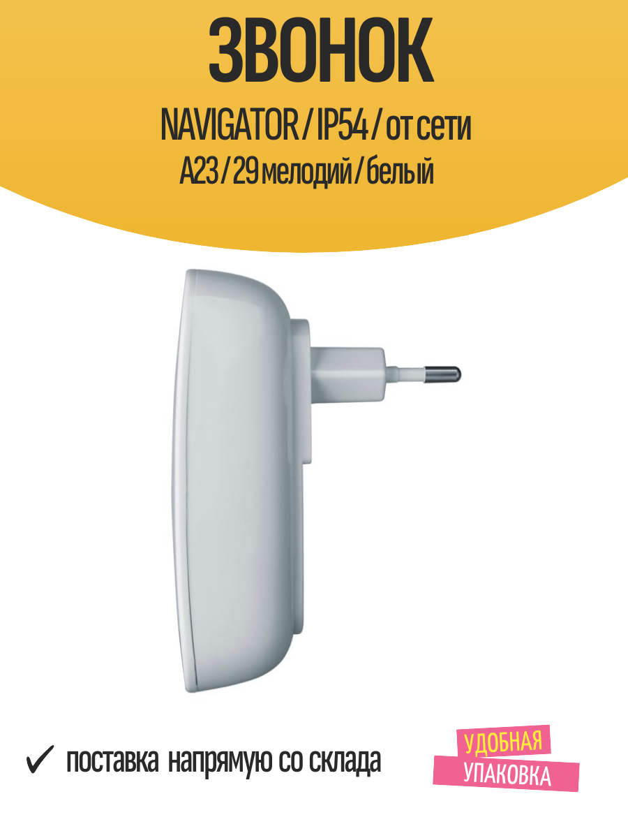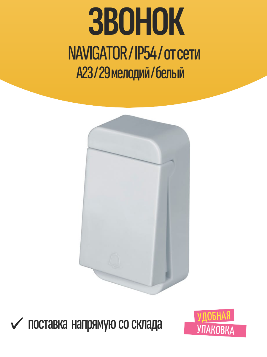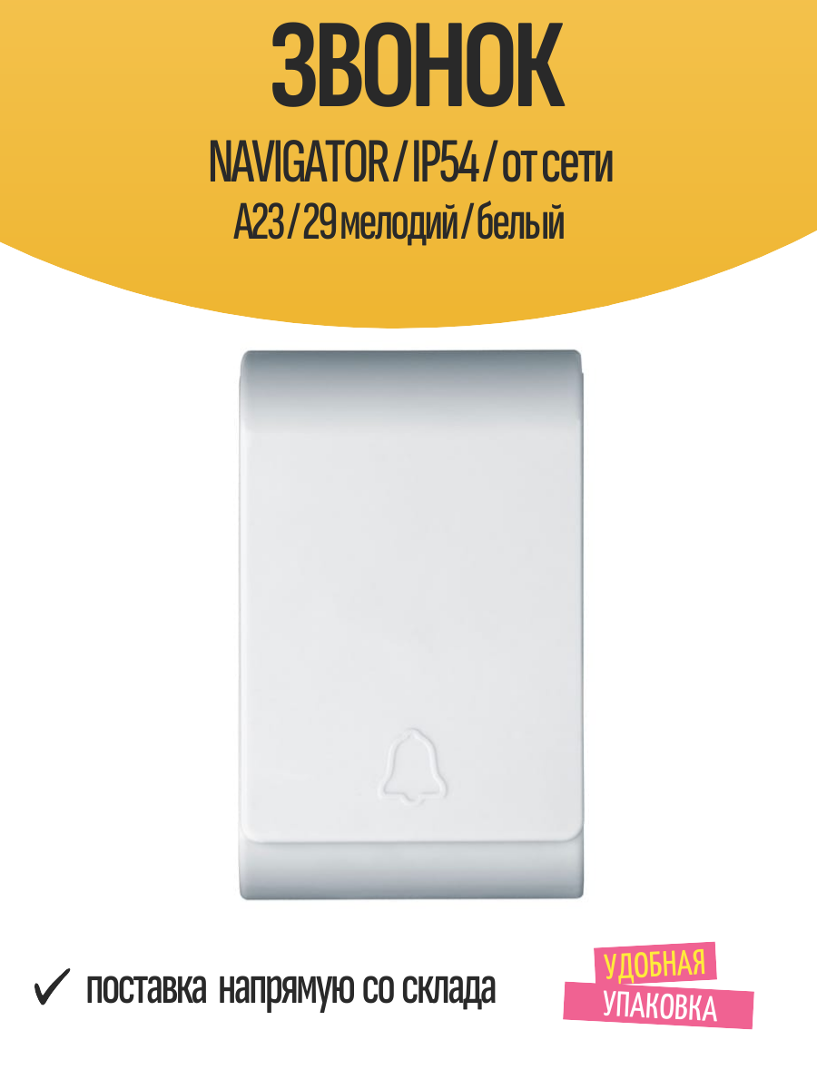 Купить Звонок дверной NAVIGATOR / IP54 / от сети А23 / 29 мелодий / белый с доставкой по всей России. Звонок дверной NAVIGATOR / IP54 / от сети А23 / 29 мелодий / белый: сравнение цен, характеристики, фото, актуальное наличие и цены.