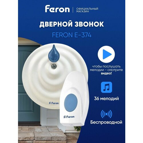 Звонок электрический дверной беспроводной FERON E-374, 36 мелодий, дальность действия 80м, цвет белый/синий, регулировка громкости - да, шифрование сигнала - нет; база: 2*1,5V/AA, 35*100*100 мм, кнопка: IP20, 12V 23A*1 (в комплекте) , раб. t -20.+70°С , размер кнопки 35*75*25мм