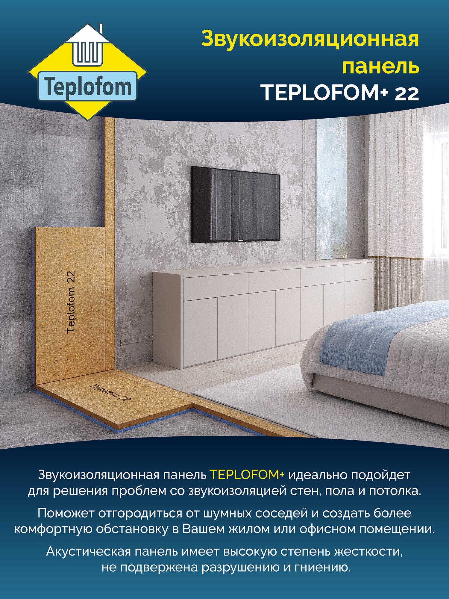 Улучшенная звукоизоляционная бескаркасная многослойная система. Панель предназначена для профессиональной шумоизоляции стен, пола, потолка с минимальной потерей в площади, дополнительной гидроизоляцией, утеплением и готовностью под финишную отделку.